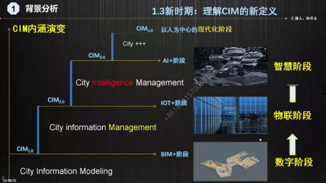 孙教授从城市、信息、模型三个维度对CIM提出了新的定义,他认为CIM是新时期新阶段特定的代名词,具有“时间维+空间维+业务维”高度动态融合属性。他对CIM的理解分为四个阶段:City Information Modeling阶段为BIM的数字化阶段;City Information Management阶段强调城市的信息化管理,这个阶段融入了IoT物联的感知;City Intelligence Management进入了AI的智慧化阶段;最终CIM可能会逐步发展成以人为中心的现代化阶段。