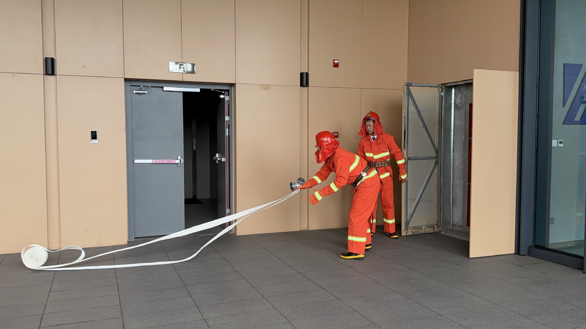 演练设定为13楼发生火情,监控中心发现后,迅派员前往查看,并启动消防警铃,灭火组人员迅速携带消防器材前往模拟着火点进行灭火;物业工作人员操作电梯迫降。