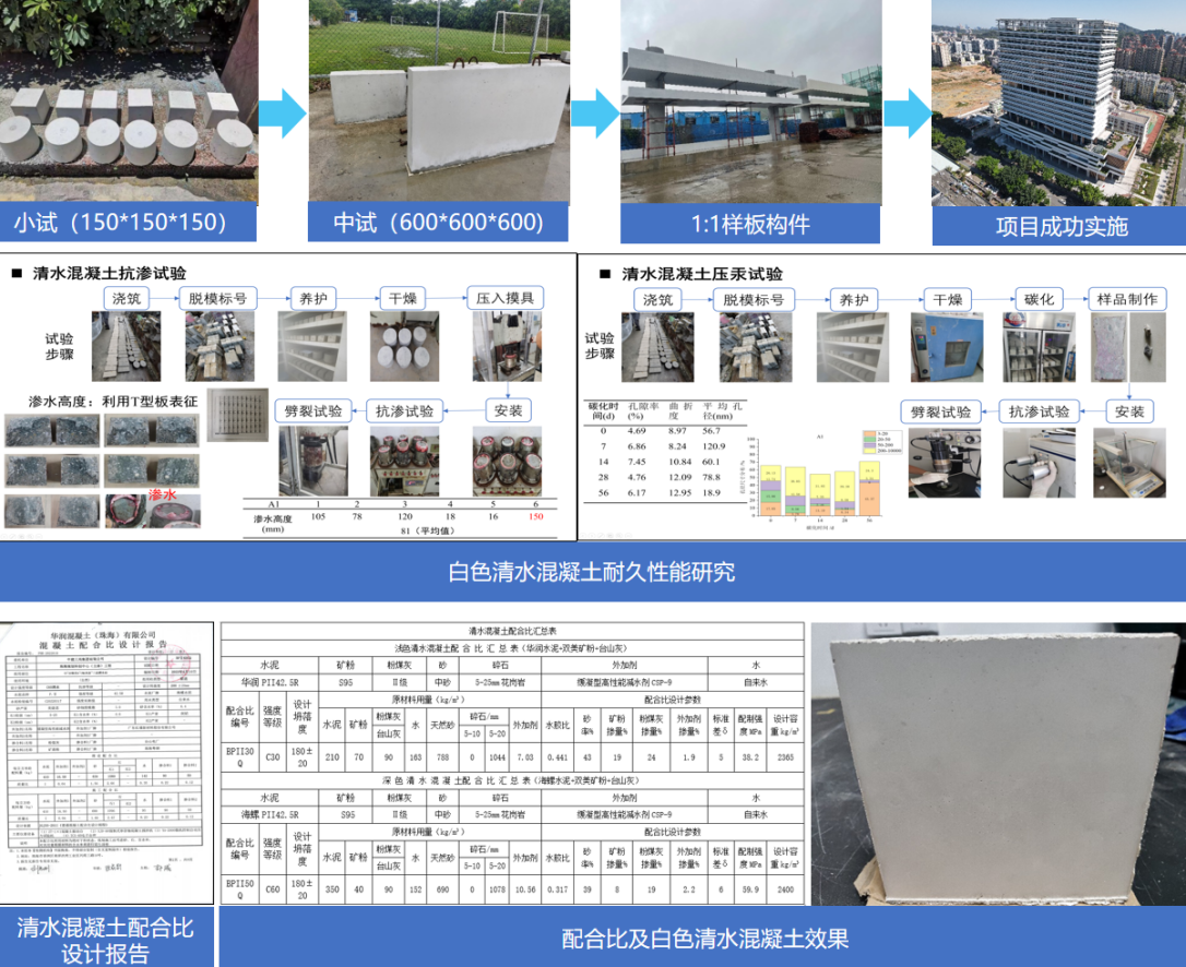 通过小试→中试→1:1样板构件试配研究,实现腐蚀环境下深浅双色清水混凝土观感、耐久性及稳定性均达到优越。