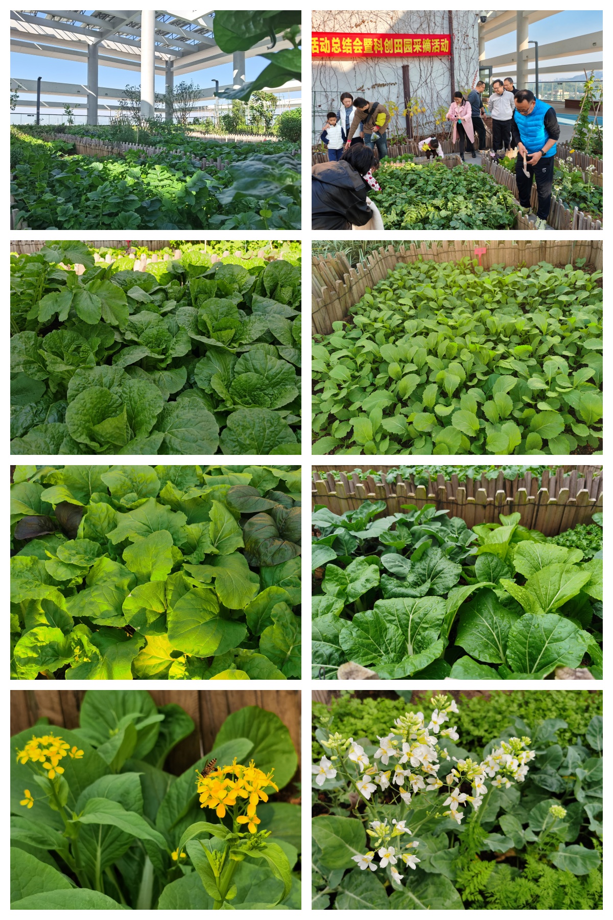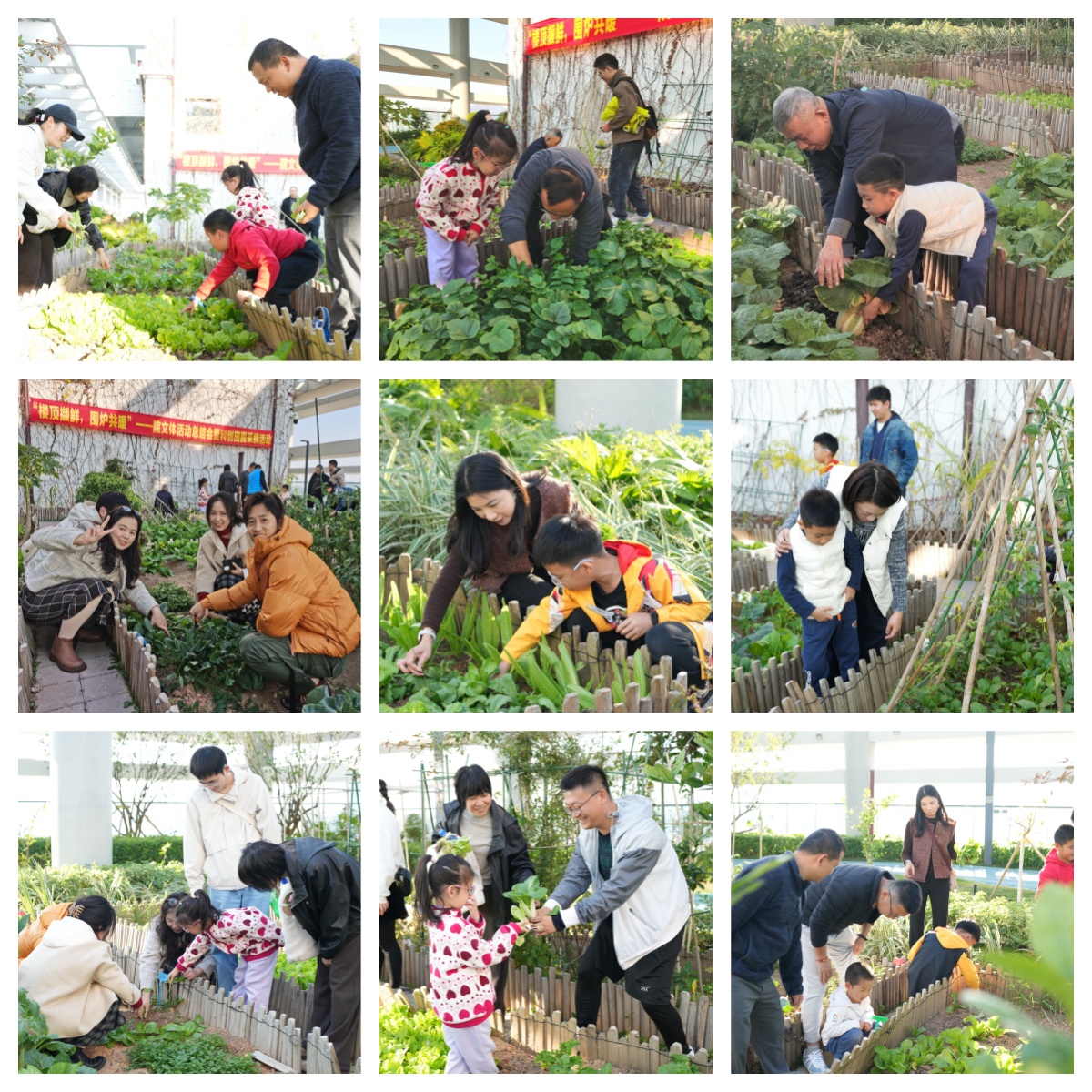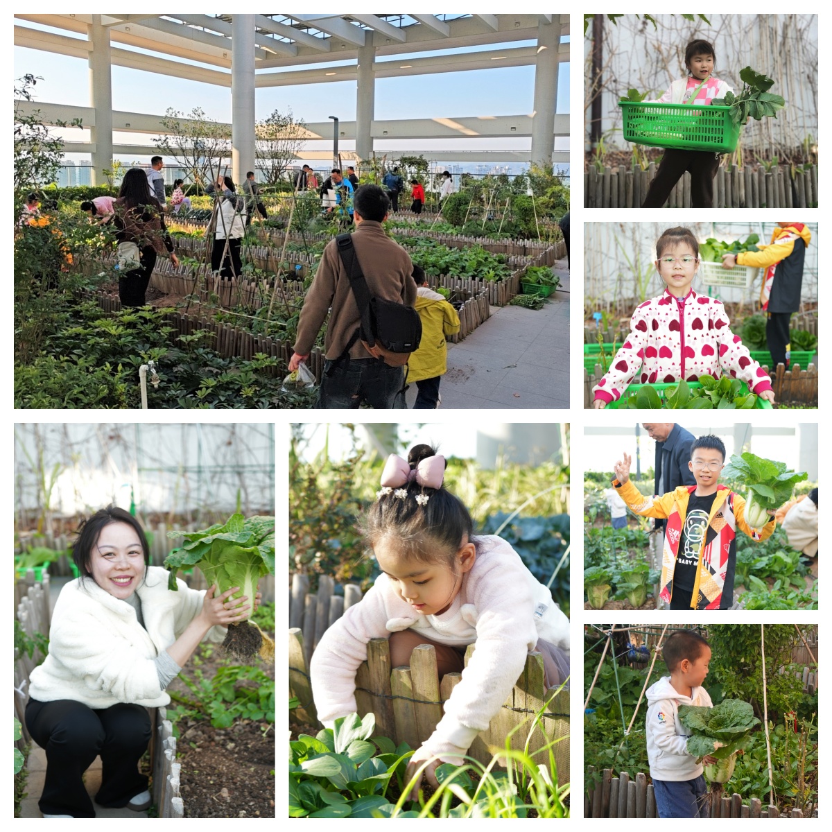 随着院工会主席陈列基宣布采摘开始,大家纷纷穿梭在这片位于城市高空的碧绿田园间。种植社成员自豪地向来宾介绍自己的“责任田”,孩子们则早已按捺不住内心的兴奋,在大人带领下一边好奇地辨认菜种,一边迫不及待撸起袖子俯身采摘新鲜蔬菜。