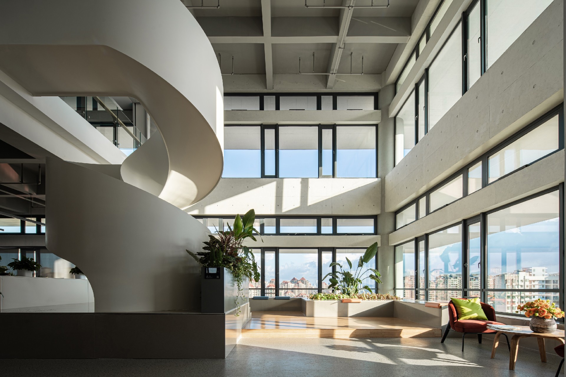 围绕“全龄友好共享社区,以人为本产业新空间”的核心理念,刘萍萍副院长详细阐释了如何通过空间复合设计实现城市开发与公众利益共赢。科创中心打破传统办公模式,通过架空骑楼、室外敞梯、公共绿化平台等交互场景,构建了多功能复合与社区共享的开放空间,建筑始终以一种开放的姿态服务社会。室内旋转梯、木纹阶梯、开敞书架等元素的融入,进一步丰富了空间的功能与美学价值,并鼓励使用者之间交流与互动。同时,室外楼梯处的垂直绿化设计,不仅美化了建筑外观,还为使用者提供了与自然亲密接触的机会,设计中,将创新思维贯穿于各个空间,使空间美感体验更加生动,彰显了建筑美学与创新的紧密联系。从华夏好建筑到好房子典型案例,这座获得多项绿色认证的科创地标建筑证明:真正的可持续建筑不需要牺牲美与温度。当混凝土学会呼吸,当楼梯生长出森林,当阳光能被算法驾驭,这不仅是技术的胜利,更是对人本价值的回归。