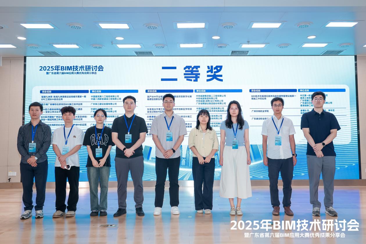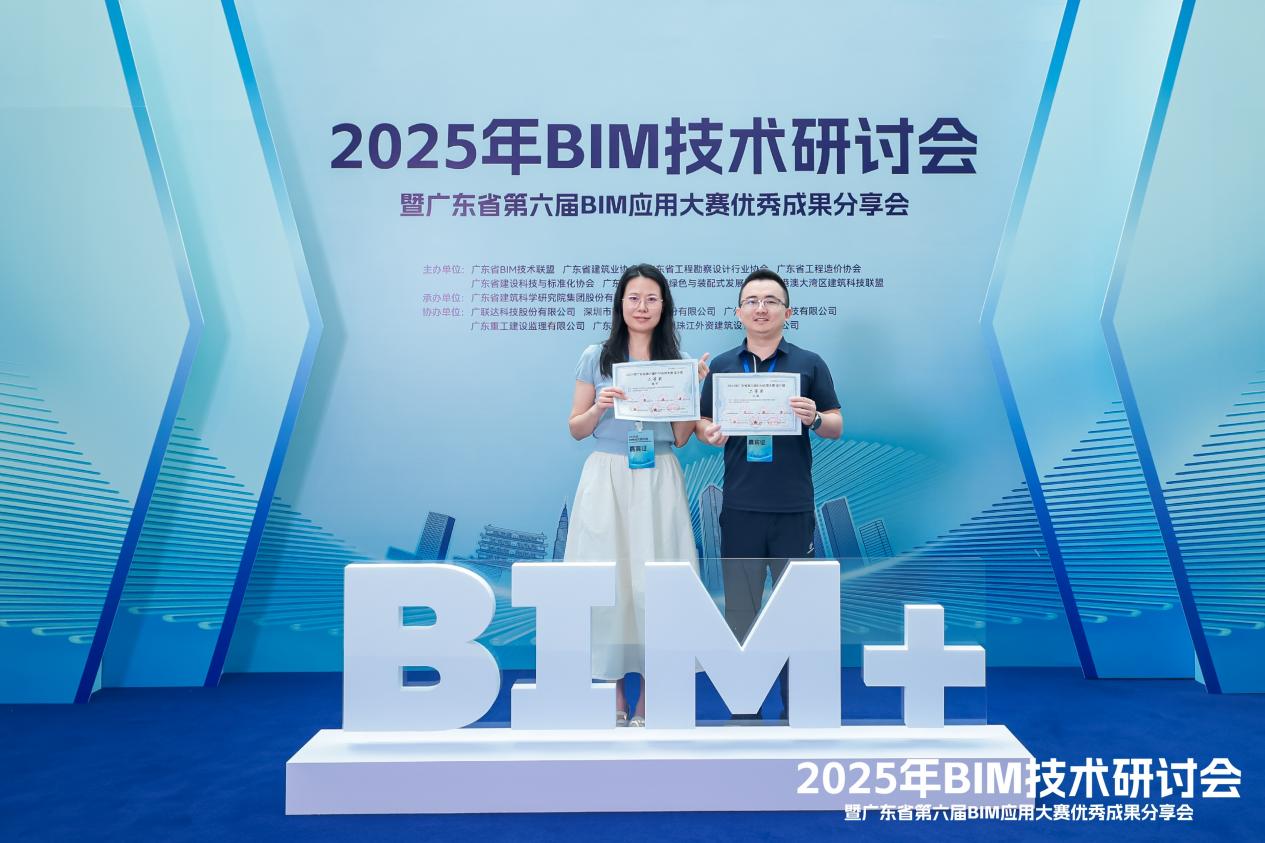 本次大会还宣读了广东省第六届BIM应用大赛获奖项目。参赛项目分为设计组(国产软件组)、设计组(非国产软件组)、施工组、综合组等共计七个组别,经三轮严格评审,279个参赛作品的激烈角逐,其中一等奖共计16项,二等奖共计30项,三等奖共计43项,充分展现了BIM技术在工程实践中的多元创新与应用价值,一批兼具技术含量与实践价值的佳作强势突围,我院参赛项目“洪湾港北片区填筑及市政基础设施工程设计阶段BIM技术应用”荣获二等奖,我院胡可、迟航作为获奖代表参加了本次领奖。