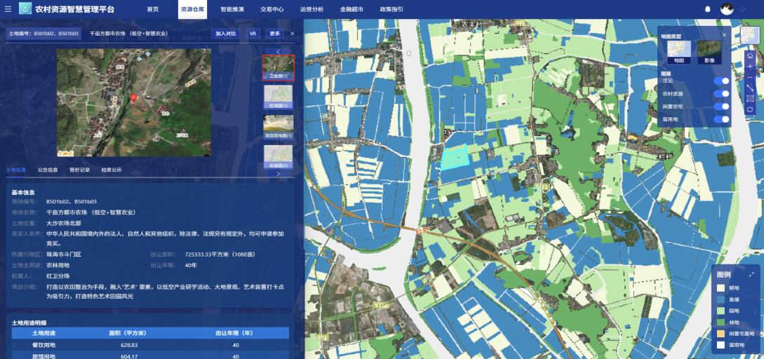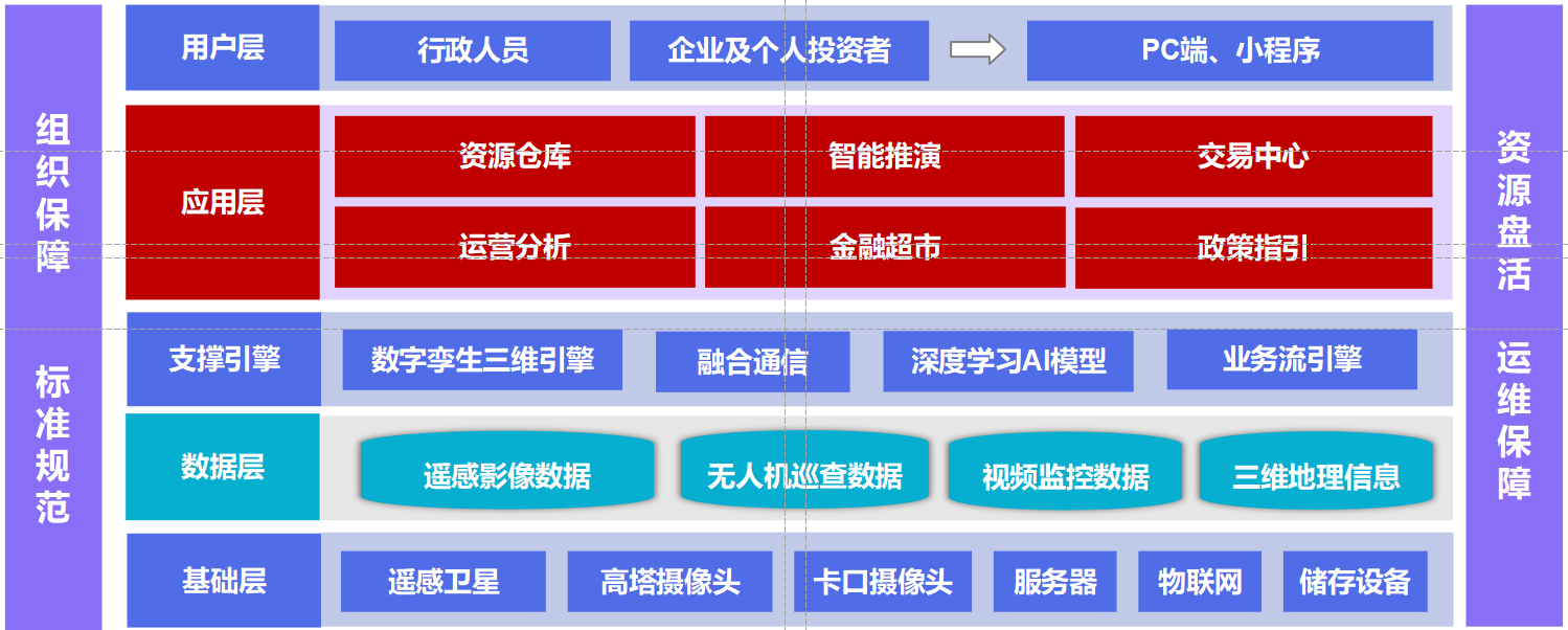 农村资源智慧管理平台,聚焦珠海农村资源管理痛点,针对资源闲置、产权分散、技术落后、市场机制缺失等问题,以“资源摸底-价值评估-招商引资-运营增值”为核心闭环,构建基础层(硬件支撑)、数据层(整合多部门数据与实时采集数据)、支撑层(AI模型与数字孪生引擎)、应用层(核心功能模块)、用户层(多端适配)的五层技术架构,开发资源仓库(“超市化”选地+VR实景)、智能推演(AI选址匹配)、交易中心(线上竞投与全流程留痕)及金融超市(无抵押贷款匹配)、政策指引(三级政策拆解)等功能,推动农村资源高效盘活与价值转化。