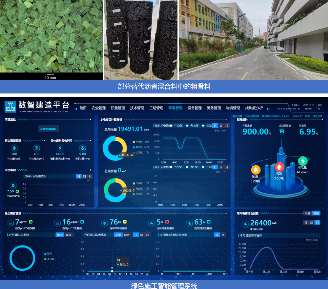 风机叶片在沥青混合料的首次创新应用,与绿色施工智能管理平台共同构成大型公共建筑绿色建造技术。